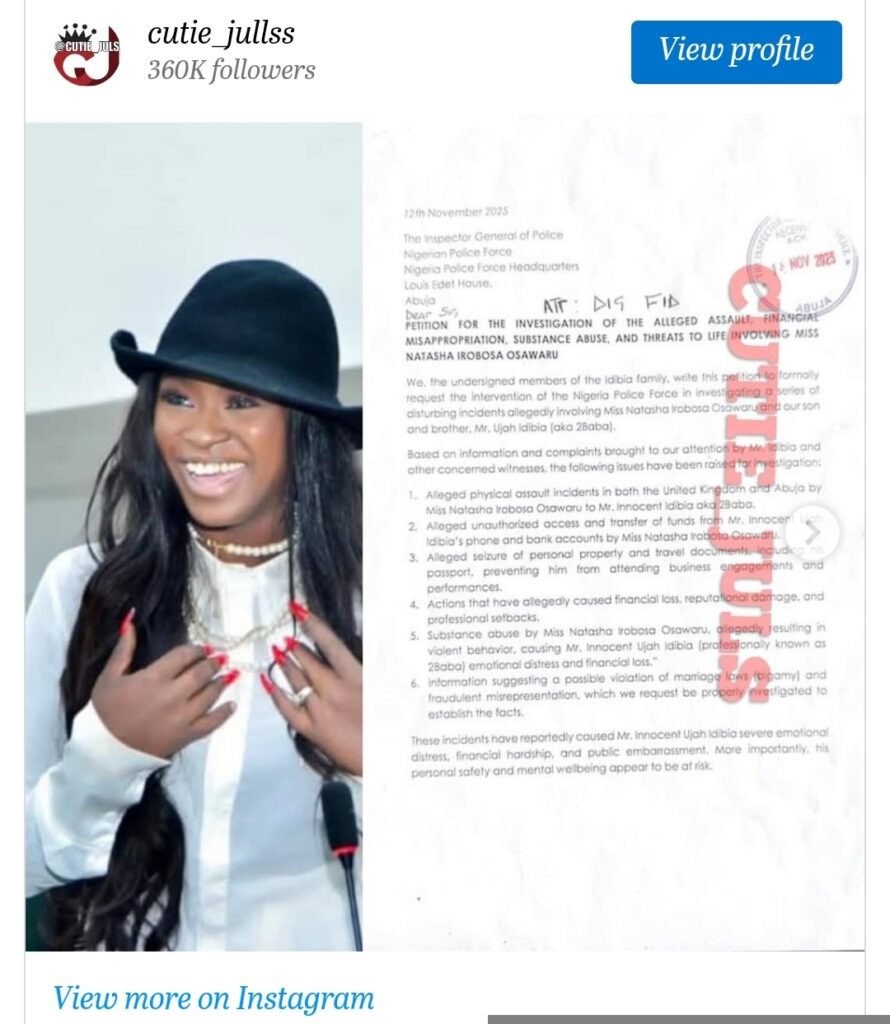 “2Baba’s family has petitioned the Inspector General of Police, accusing his wife, Edo lawmaker Natasha Osawaru, of assault, drugging, financial misconduct, and bigamy. The petition follows previous reports of the singer’s disappearance and escalating domestic disputes.”