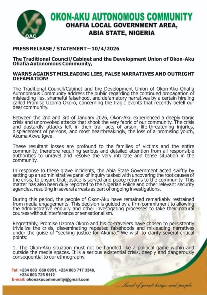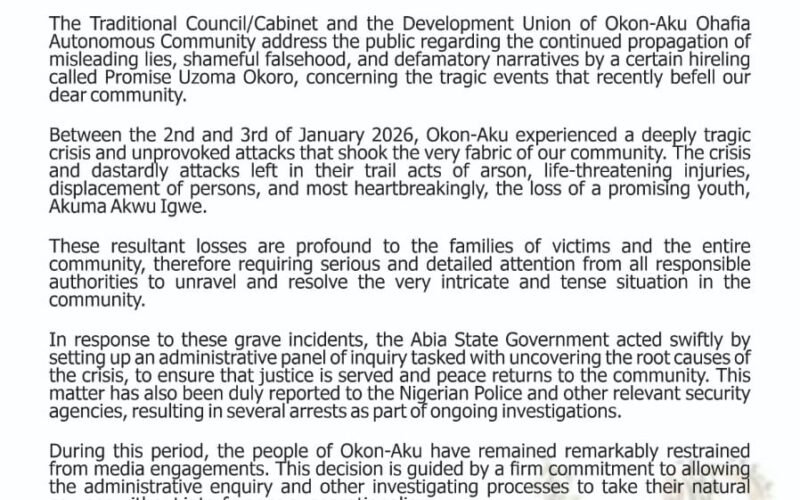 “The Okon-Aku Autonomous Community in Ohafia LGA, Abia State, has condemned the spread of false narratives and defamation surrounding its January 2026 crisis, urging the public to rely on verified investigations while reaffirming its commitment to justice, peace, and accountability.