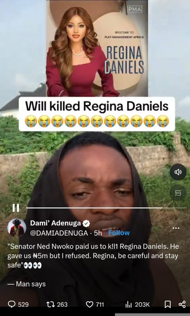 A young Nigerian man has stirred intense controversy online after alleging that Senator Ned Nwoko offered him and several others N5 million each to assassinate his estranged wife, Nollywood actress Regina Daniels.